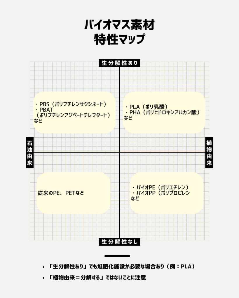 - 石油由来のPBAT → 生分解性があっても、バイオマスプラスチックには該当しない